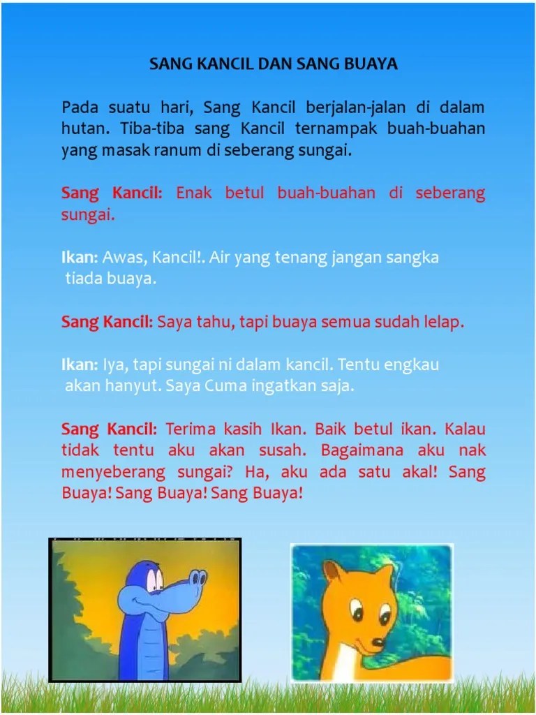 Buatlah gambar sederhana berdasarkan cerita dongeng si kancil dan buaya dengan akhir cerita yang kamu buat. Sang induk pun sangat senang dan berterima kasih kepada kancil yang . Yuk, bacakan ceritanya untuk si kecil. Sang kancil dan buaya darjah : Sang kancil terus berpikir mencari akal bagaimana cara menyeberangi sungai yang sangat dalam dan deras arusnya itu.